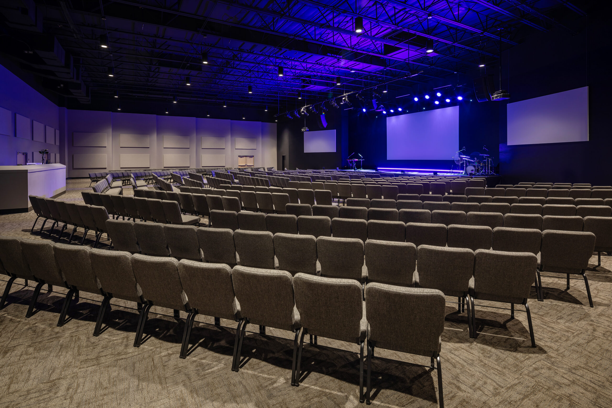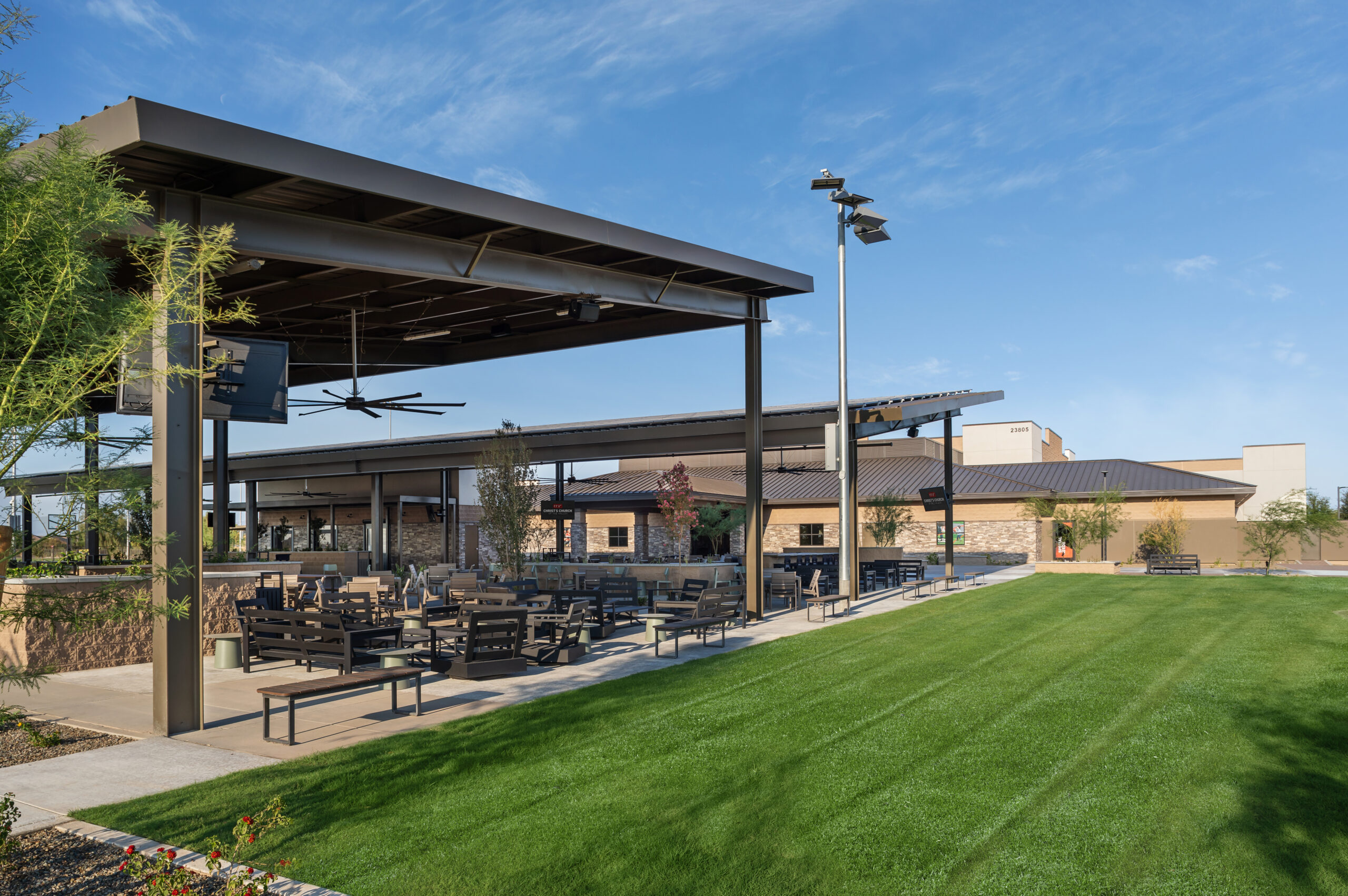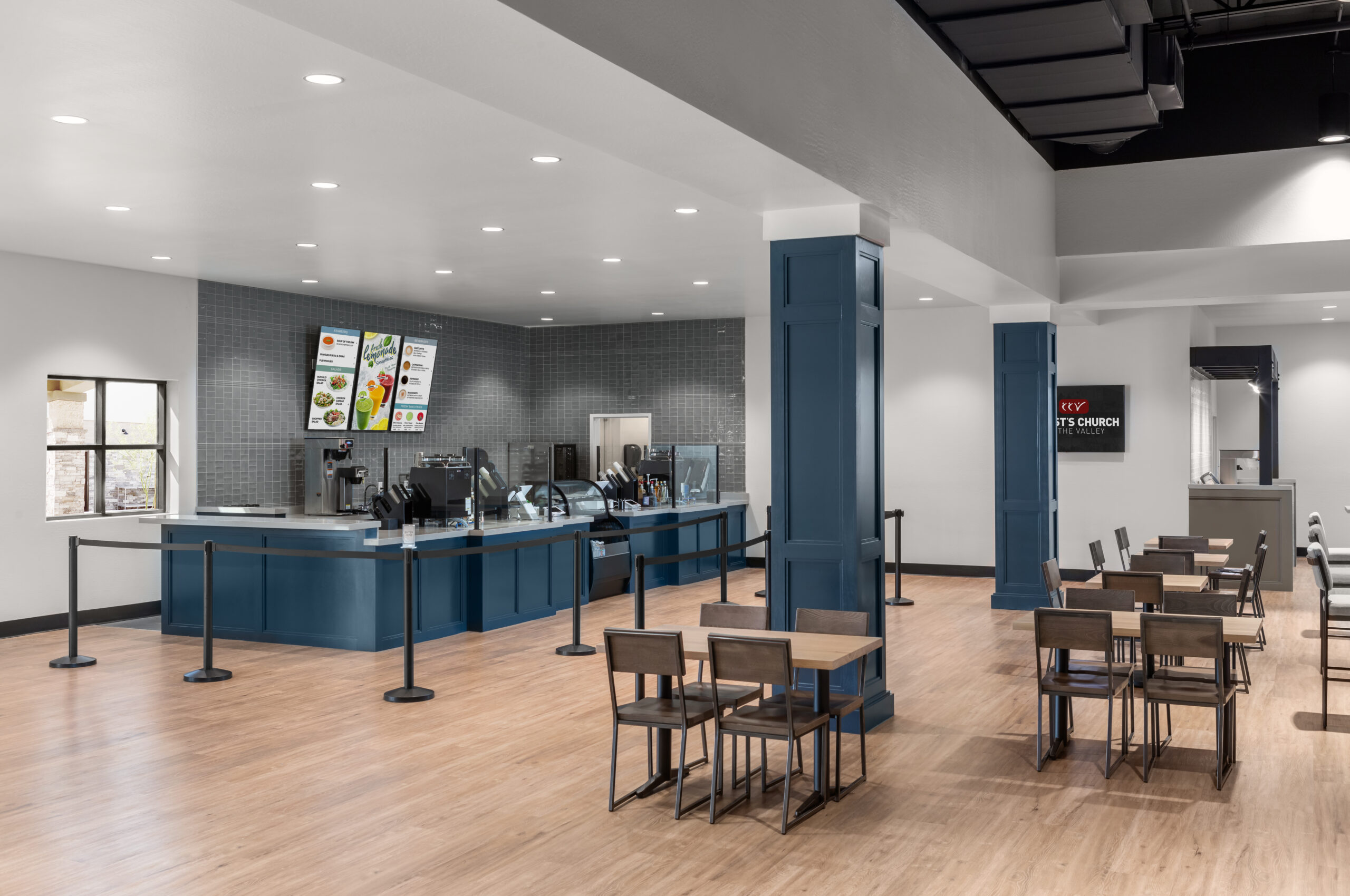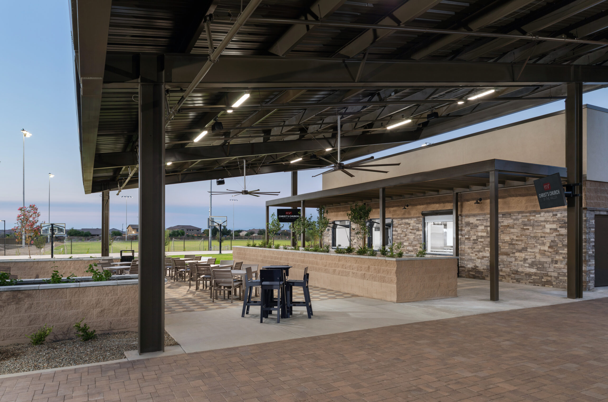 Located at the southeast corner of Ellsworth and Chandler Heights, the new church will occupy a 16-acre site with a 32,866 SF main building. It will feature a commercial-grade coffee bar, green room, daycare, classrooms, restrooms, and a central worship room with seating for 1,060, a platform for performances, and advanced sound and lighting systems. The outdoor spaces are equally impressive, with solar canopies providing 12,902 SF of shaded seating and play areas, a 719 SF outdoor kitchen, and high-end courtyard finishes. CCV also set aside 2.81 acres for athletic fields and sports courts for the CCV Stars youth program, complete with stadium lighting and natural grass. A multi-use walking trail connects the fields to the main building.