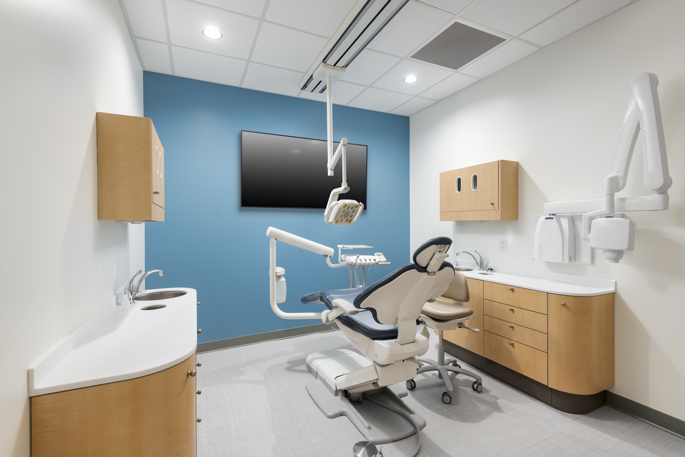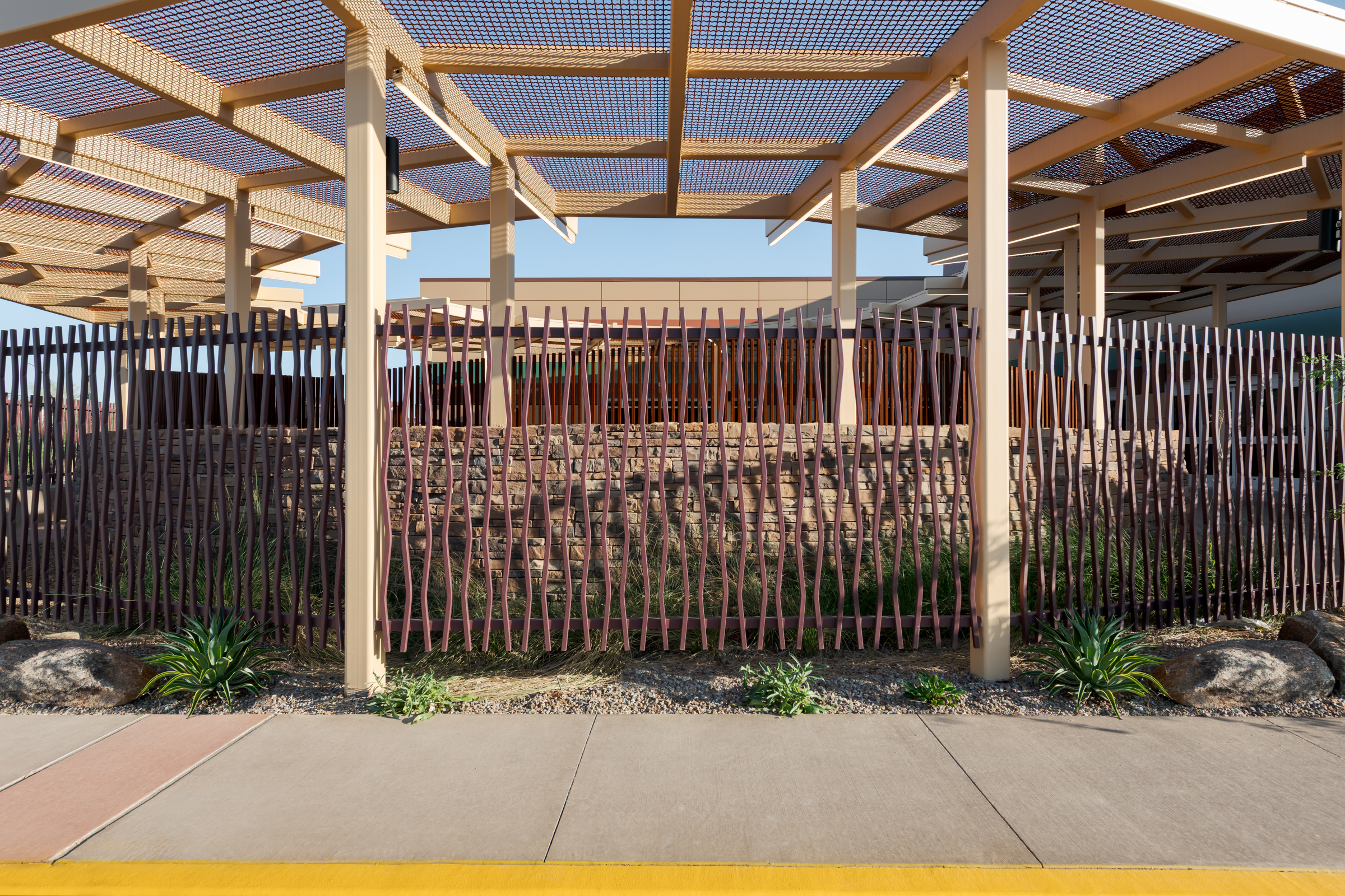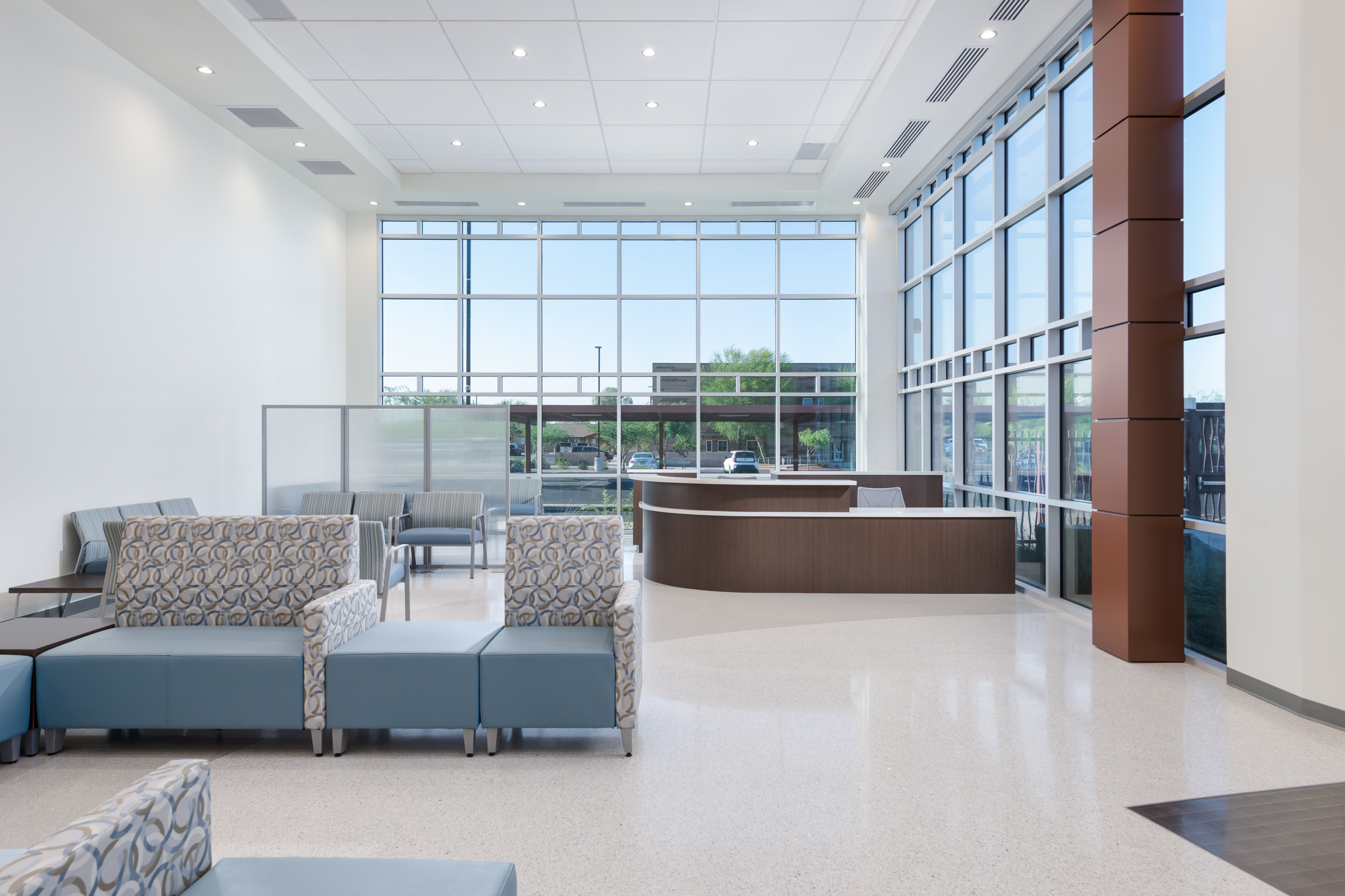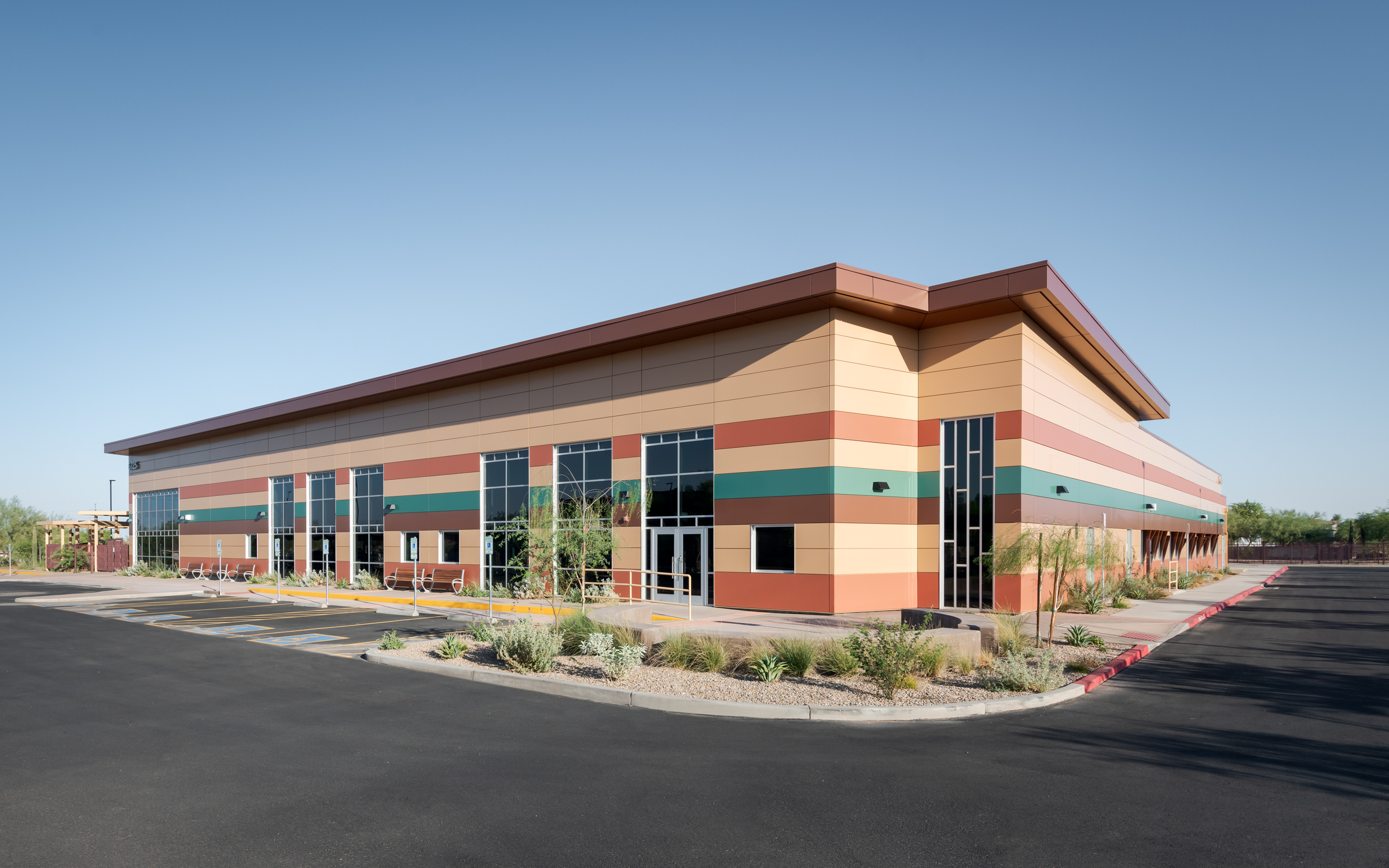 Phase 1 included construction of a new 34,422-square-foot, single-story outpatient clinic on a vacant 5-acre site. The building’s interior is designed for multiple uses and tenants, including a community gym, physical therapy, pharmacy, dental services, and general clinic space. Site work features a monument sign, a fenced courtyard for community events, fenced staff parking, covered patient parking, and extensive landscaping. Additional special features include a 1250KW emergency standby diesel generator, custom terrazzo flooring with mosaic designs, and a jib crane for roof and RTU maintenance. Phase 2 included construction of a new 5,830-square-foot, single-story addition, integrated with the Phase 1 construction, to provide additional administrative space for the clinic.